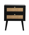 Featuring a mix of all-black wood-like materials with a genuine ratan front drawer panel, the bedside table has all the vibes of an eclectic piece that transcends style and trends. The twin drawers are blessed with ample closed storage space whilst the table top provides additional real estate for your frequently used personal items or display mementos.