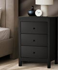Introducing our newly launched bedside table by - a chic and functional addition to enhance your bedroom decor. This stylish bedside companion features a pristine black finish that effortlessly complements any interior aesthetic. With three drawers adorned with elegant black knobs, this bedside table not only provides convenient storage but also adds a touch of sophistication to your bedside essentials.