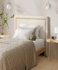 Stunning and simple. Our Bed Head can quickly and easily transform your mundane bed into one of exquisite class and elegance. Wrapped in premium fabric upholstery and augmented by a rich padding that is inviting and sumptuous, the bed head adds a visual and tactile dimension to your bed with its dotted accents for exceptional charm and comfort. The clean lines ensure that it effortlessly complements a wide variety of bedroom decor to suit your personal style with minimum hassle. Beyond the aesthetics, the tall fabric bed head also provides exceptional support for your back and head as you lie back to enjoy your favourite bedroom past times. No more stacking of pillows to get the right backing while sitting upright in bed. The attention to details is meticulous that marries good craftsmanship with quality materials such as the pine wood construction that lends the bed head its strength and durability. Plus, the sturdy legs also ensure the bed head can stand up to robust use time and again. Finished in white hues and available from Single to King sizes, the bed head is easy on the eye and senses and would be perfect for matching similarly-styled bed frames for a well-blended furniture piece. Never look at your bed the same way again. The Bed Head will certainly elevate it to a splendid spectacle that you will surely appreciate.