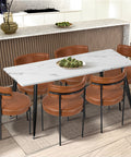 With its luxurious PU Leather upholstery generously padded with high-density foam for the seat and backrest and, you're sitting on prime comfort. The contoured backrest also provides ample support for you to sit back and enjoy the seat. Soft and satisfying, the feeling is as good as savouring that delicious meal served to you. Aesthetically, the dining chair is simply captivating with its sleek powder-coated metal legs in chic black to accentuate the richness of the seat and curved backrest. A minimalist styling that renders maximum presence.