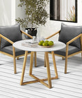 The Livsip 3PCS Outdoor Dining Set features a durable steel frame and weather-resistant materials that resist fading and rust. It includes a 90cm round table with a low-maintenance sintered stone top and two comfortable lounge chairs with plush, quick-drying cushions. Perfect for relaxing or dining outdoors, this set combines style, comfort, and easy care for lasting enjoyment.