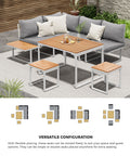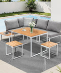 Enjoy outdoor living with the Livsip 6 Seater Outdoor Dining Sofa Set, designed for comfort and style. This versatile set fits balconies, patios, or even indoor spaces, featuring a spacious sofa with a detachable backrest, a built-in side table, and a dining table with a stylish panelled top. Made with durable, weather-resistant materials and removable cushions, it offers easy care and lasting enjoyment. Perfect for relaxing, dining, or socializing, this set combines practicality with elegant design to enhance any space.