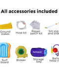 - 12 play zones: Ball pit, trampoline jump, dual water slide, 5m water slide, climb, dual sprinkler, water gun, crawling, ball target, circle, basketball hoop, water bowl